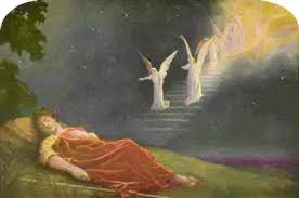 Y tuvo un sueño: Soñó una escalera que se apoyaba en tierra y con la punta tocaba el cielo, y los ángeles de Dios subían y bajaban por ella. Vio que el Señor estaba en lo alto de la escalera y oyó que le decía: