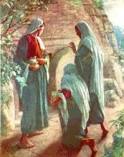 Después de escuchar las palabras del ángel, las mujeres se alejaron a toda prisa del sepulcro, y llenas de temor y de gran alegría, corrieron a dar la noticia a los discípulos. Pero de repente Jesús les salió al encuentro y las saludó. Ellas se le acercaron, le abrazaron los pies y lo adoraron. Entonces les dijo Jesús: "No tengan miedo. Vayan a decir a mis hermanos que se dirijan a Galilea. Allá me verán".