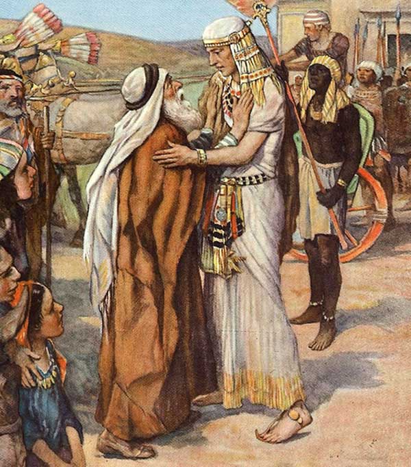 Jacob mandó a Judá por delante para que le avisara a José y le preparara un sitio en la región de Gosén. Cuando ya estaban por llegar, José enganchó su carroza y se fue a Gosén para recibir a su padre. Apenas lo vio, corrió a su encuentro y, abrazándolo largamente, se puso a llorar. Jacob le dijo a José: "Ya puedo morir tranquilo, pues te he vuelto a ver y vives todavía".